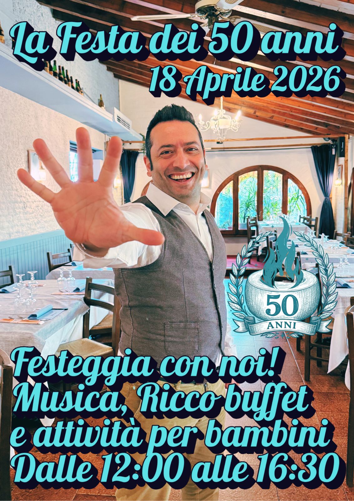 Partecipa alla nostra festa dei 50 anni del ristorante e 30 di gestione. Buffet illimitato, gadget di partecipazione musica e molto altro ancora